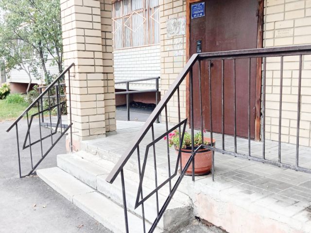 Чистый подъезд с металлической дверью.