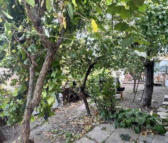 На участке высажены плодовые деревья: груша, слива, яблоня и кусты винограда. Остальная территория имеет кладку плиткой.