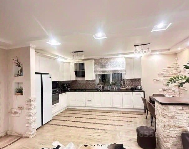 Просторная кухня-гостиная (35 кв.м.) с барной стойкой, каминной зоной.