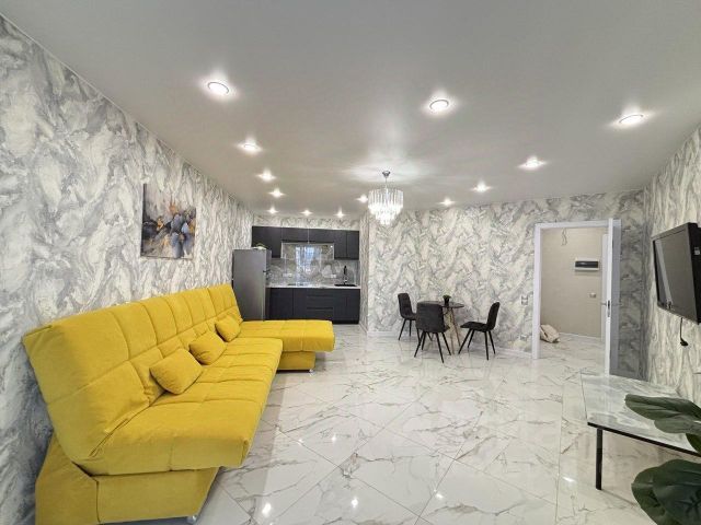 Квартира с прекрасным видом на город от Кумысной поляны до Журавлей, состоит из кухни-гостиной, спальни с гардеробной, санузла и прихожей.