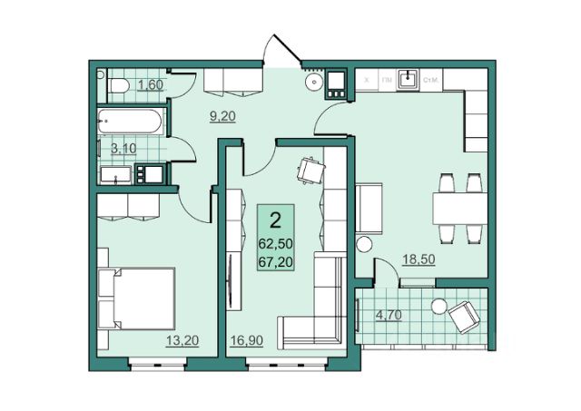 Квартира имеет площадь 67,2 м2. В просторная гостиной 16,9 м2 можно разделить зоны на рабочую и зону отдыха. Кухня 18,5 м2 с выходом на лоджию с панорамным остеклением позволит разместить обеденную зону, зону отдыха и небольшой домашний огород. Спальня 13,9 м2 станет местом уединения, в которой можно будет разместить не только большую двуспальную кровать, но и систему хранения или туалетный столик, не перегружая пространство.