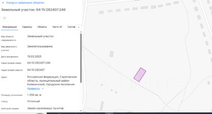 Данные получены с сайта ГИС Торги. Земельный участок с кадастровым номером 64:15:282407:246, площадью 1250 (одна тысяча двести пятьдесят) кв.м