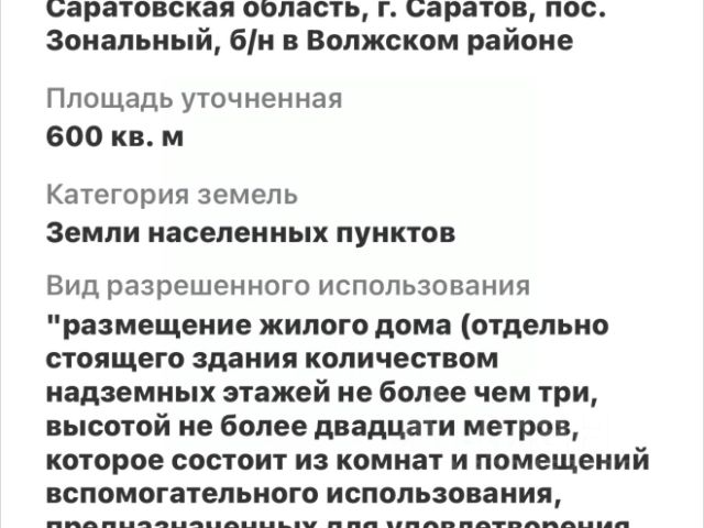 Арт. 87875984. Добрый день!Продается земельный участок!Отличное предложение для строительства дома вашей мечты , в тихом и уютном уголке Саратова ! До центра города 15 минут езды, школа и садик в шаговой доступности ( 10 минут пешком ) Отличные дружные соседи ! По границе участка проведен газ Центральное водоснабжение заведено на участок ! ( зимняя вода ) Летняя вода с апреля по октябрь так же на участке , без перебоев и с отличным напором ! Свет на участке , все новенькое , проведено этим летом ! Участок полностью разровняли , убрали и выкорчевали все старые деревья с корнями . Остались 3 отличных , плодоносящих дерева ( слива , яблоня , груша ) Можете приступать к строительству дома своей мечты уже завтра !) Спешите преобрести отличный , ровный , квадратной формы участок ! А Так же !!!!! Если вас интересует участок больших размеров , по соседству так же продаем участок размером 5,5сот . ! В итоге вы можете преобрести 2 участка участка в общей сложности 11.71сот ! Все в собственности , ни каких долгосрочных аренд , эта земля только ваша на всегда ) Цена в объявление указана за 1 участок Продажа только за наличные , ждем ваших звонков !) Кадастровый номер:64:48:030108:353 Продается загородная недвижимость на проезде 2-й Большой Семхозовский в городе Саратов.