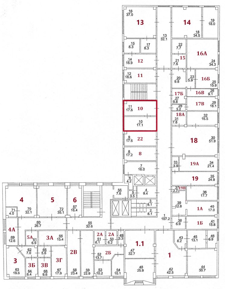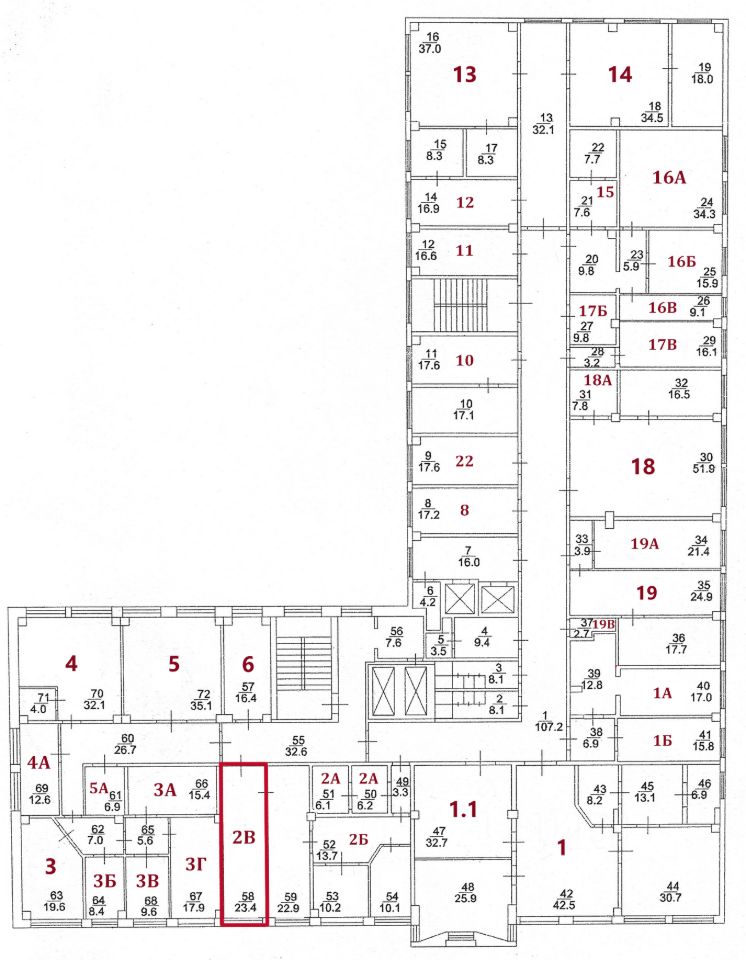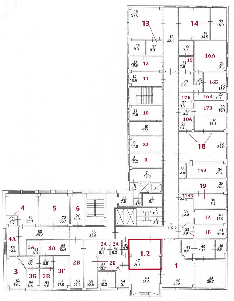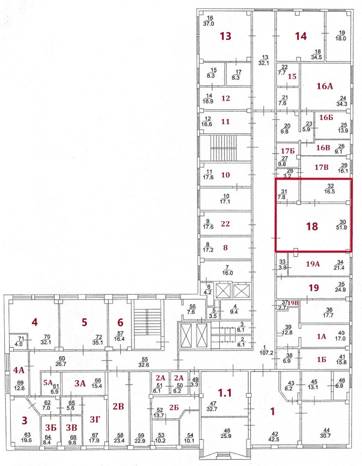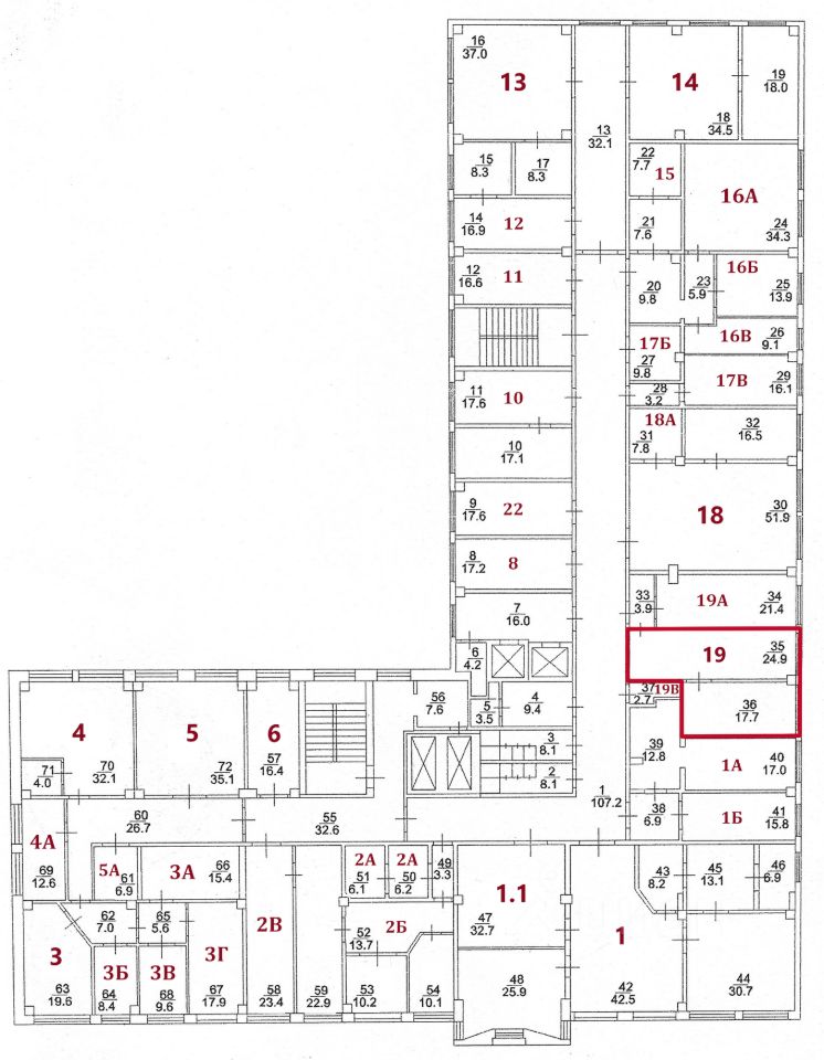 На текущий момент свободны помещения, выделенные на плане красным цветом.