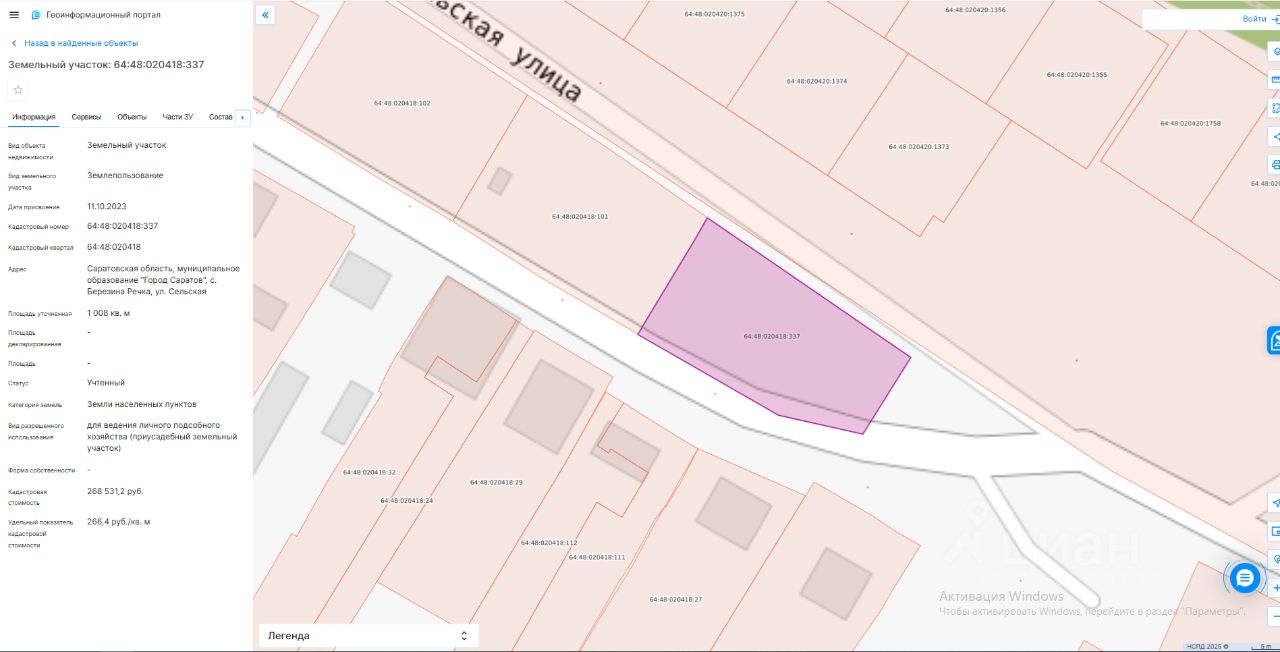 Земельный участок площадью 1008 кв. м с кадастровым номером 64:48:020418:337, по адресу: муниципальное образование "Город Саратов", с. Березина Речка, ул. Сельская