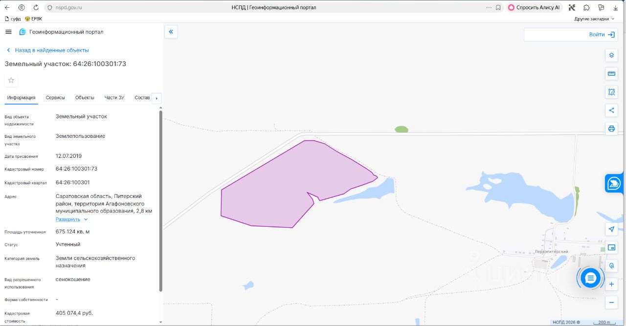 земельный участок из земель, государственная собственность на которые не разграничена, категория земель сельскохозяйственного назначения, вид разрешенного использования: сенокошение, с кадастровым номером 64:26:100301:73, общей площадью 675124 квадратных метров, расположенный по адресу: Саратовская область, Питерский район, территория Агафоновского муниципального образования, 2,8 км северо-западнее п. Первопитерский