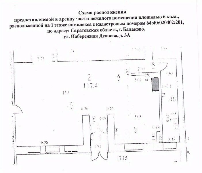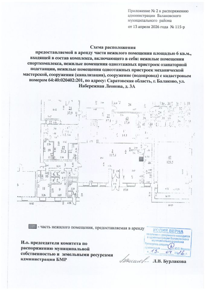 Лот 2 - часть нежилого помещения, площадью 6 кв.м., входящей в состав комплекса, включающего в себя: нежилые помещения спорткомплекса, нежилые помещения одноэтажных пристроек озонаторной подстанции, нежилые помещения одноэтажных пристроек механической мастерской, сооружения (канализация), сооружения (водопровод) с кадастровым номером 64:40:020402:201, по адресу Саратовская область, город Балаково, ул. Набережная Леонова, д.3А;