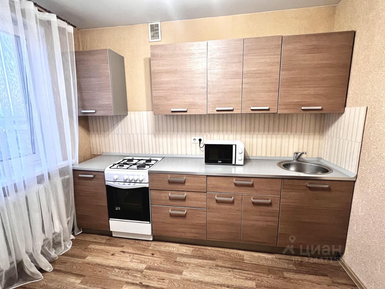 На кухне расположен кухонный гарнитур с газовой плитой ,а также расположен двухкамерный холодильник ,так же имеется электрический чайник и микроволновая печь