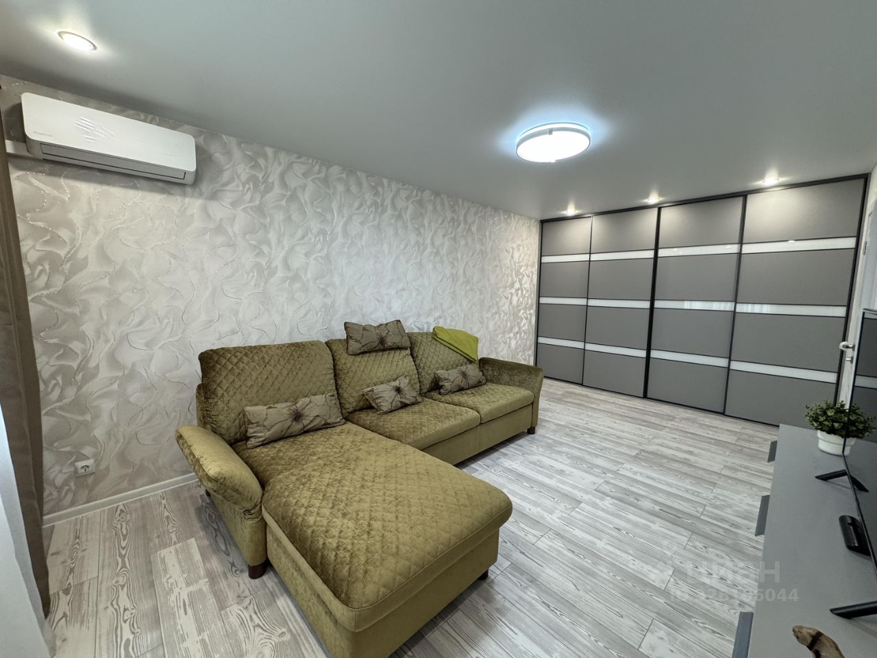 Вместительный шкафов для вещей, кондиционер, диван, стол, два стула, холодильник, микроволновка, варка, духовка, стиральная машинка, водогрейка.