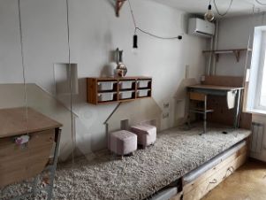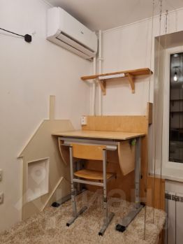 ДЕТСКАЯ КОМНАТА. Выполненная на заказ мебель из экологически чистых материалов. Подиумная конструкция покрытая ковролином, со встроенными кроватями, позволяющая разместить на самом подиуме 2 отдельно стоящих ученических места. Кровати из высококачественной фанеры , ортопедическими матрасами и бельевыми ящиками. Гардеробные шкафы из массива, собранные по индивидуальному проекту. Места для хранения игрушек,бытовых детских мелочей а также полки для детской библиотеки.Из комнаты есть выход на утепленную лоджию, на которой размещены потолочные и напольные вешала для сушки белья. В детской установлен кондиционер Haier.