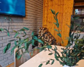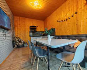 Большая, отдельная баня с панорамным окном, зоной отдыха и кухней, большой парилкой, где можно париться с вениками и поддаватьпеть в караоке и слушать музыку за отдельную плату 5000 весь день.