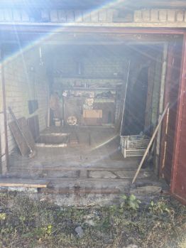 Есть свет, лестница, сусек под картошку, полки из металлического уголка. В гараж помещается машина Ниссан Террано.