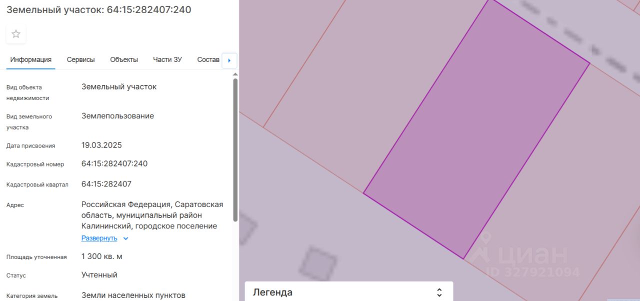 Земельный участок с кадастровым номером 64:15:282407:240, площадью 1300 (одна тысяча триста) кв.м, 8590категория земель: земли населенных пунктов, ограничения в использовании: нет, разрешенное использование: для индивидуального жилищного строительства.
