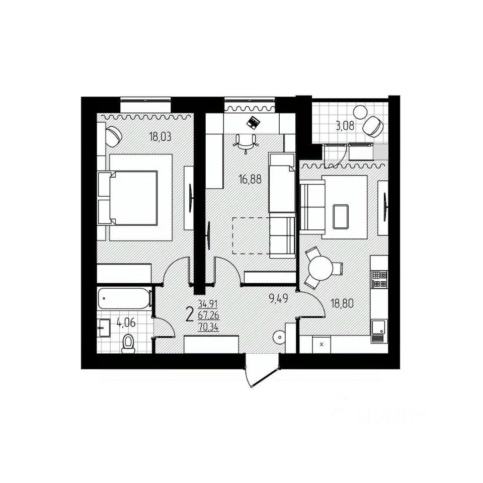 2-комн. квартира, 70,34 м²