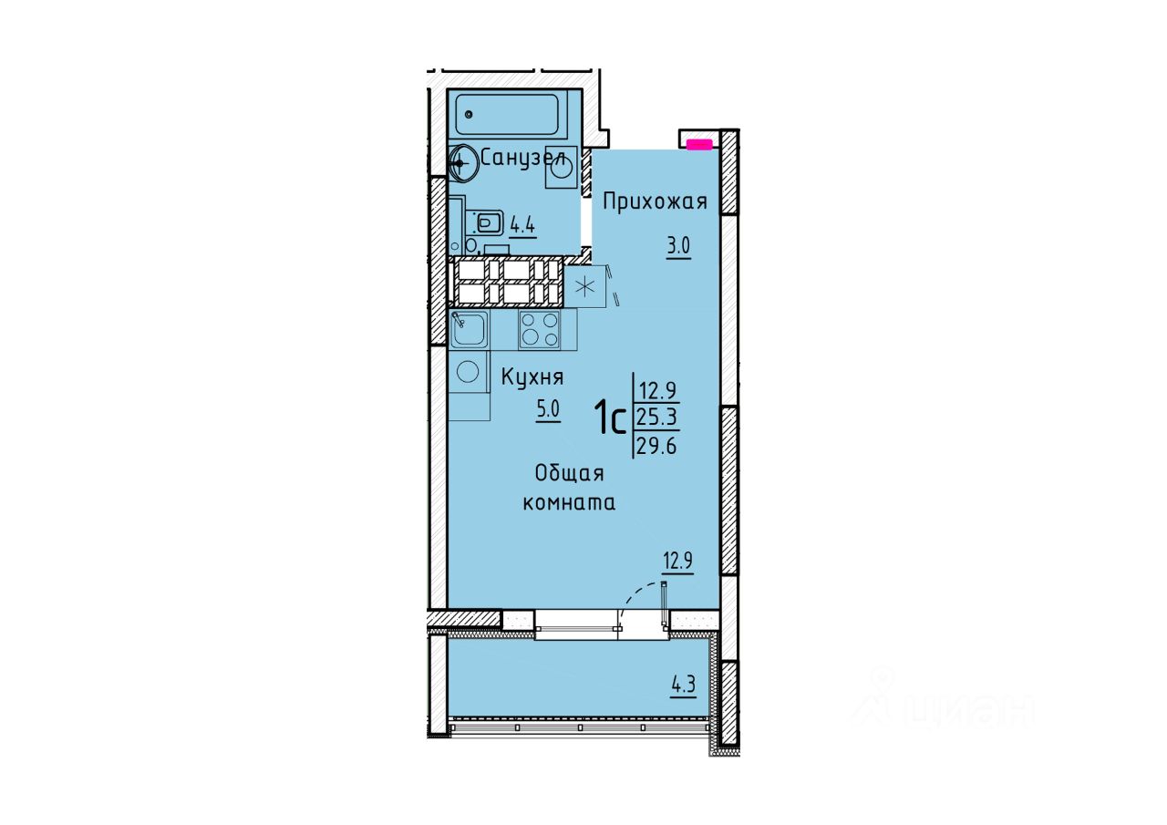 Квартира свободной планировки, 29,6 м²