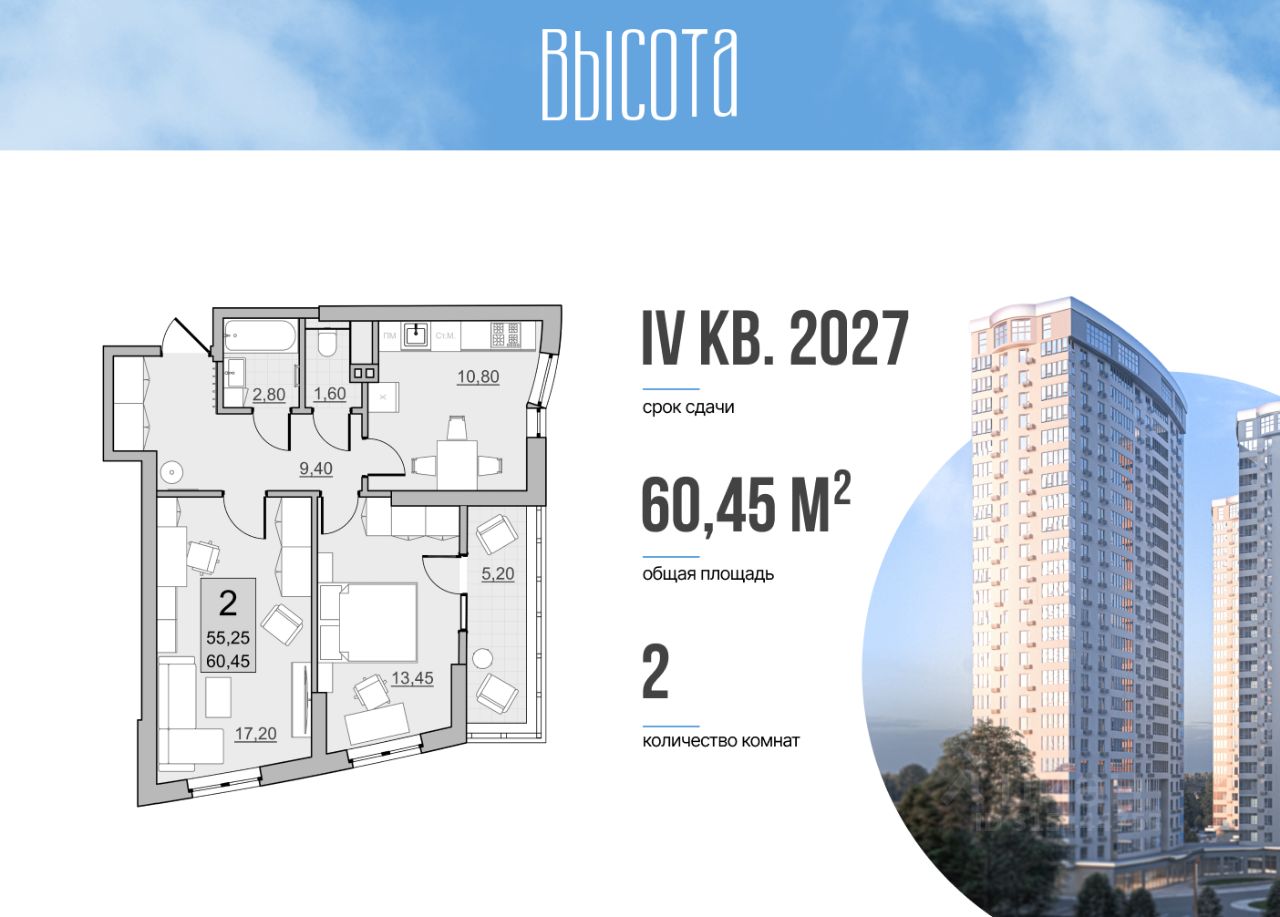 Квартира идеально подходит для молодой пары. Просторную гостиную 17,2 м2 удобно зонировать на рабочую и зону для отдыха. Спальня с выходом на просторную остекленную лоджию 5,2 м2. Большая прихожая 9,4 м2 с нишей под организацию систему хранения вещей, чтобы освободить дополнительное место в квартире.