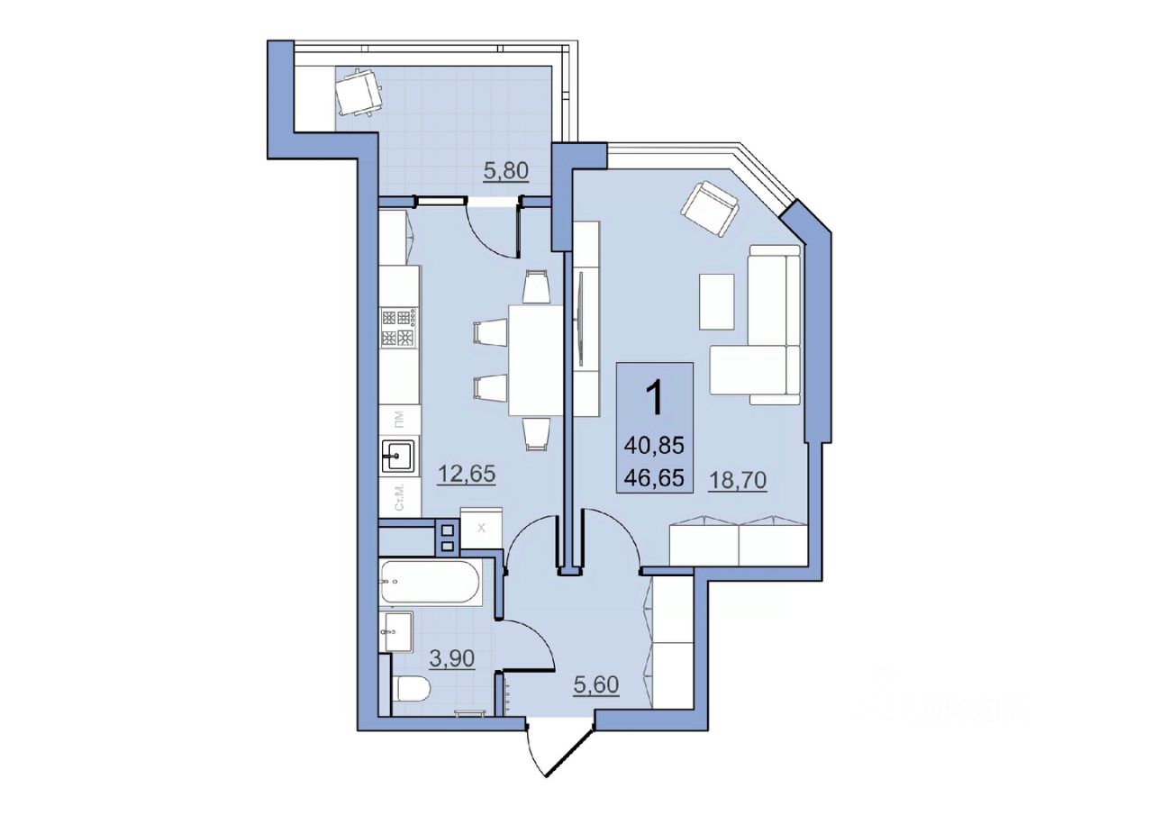 Общая площадь40,85 м²
