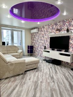 В зале пол из дорого ламината, потолок двухуровневый со светодиодной лентой, японская сплит система Gеnеrаl 12 , бесшумная.