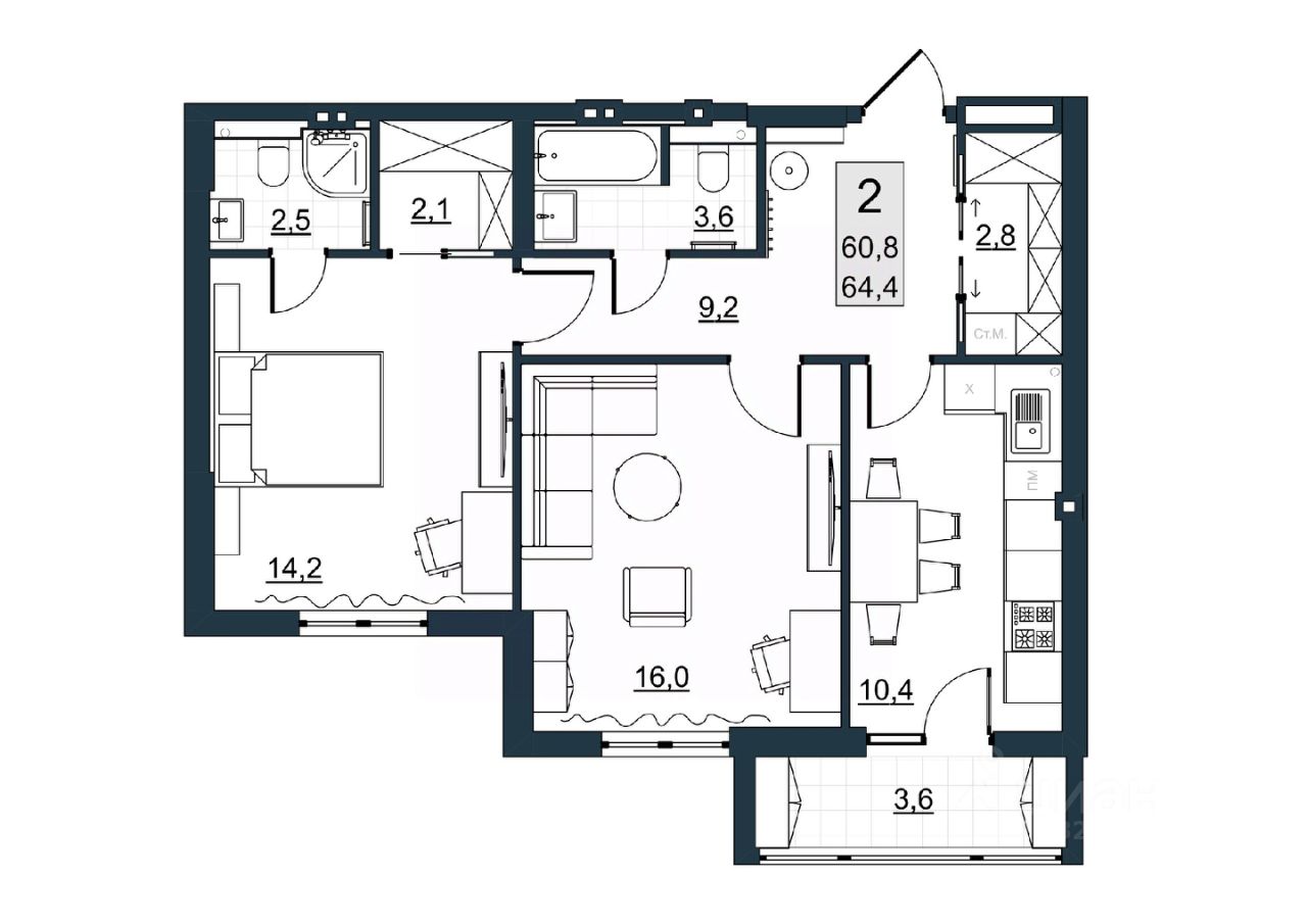 Общая площадь60,8 м²