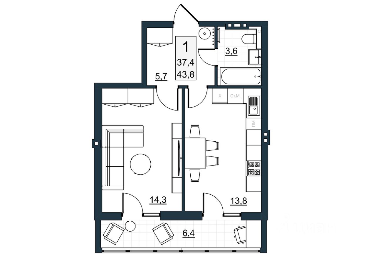 Общая площадь37,4 м²
