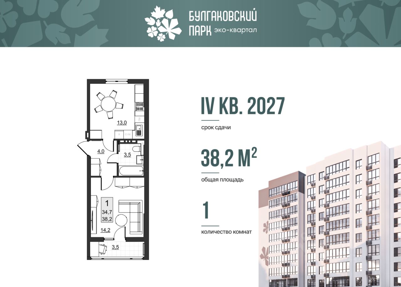 Живите по своим правилам в доме комфорт-класса! Эко-квартал Булгаковский парк входит в топ-5 федерального экспертного рейтинга по потребительским качествам. Дважды занимал призовые места в конкурсе Лучший ТОП ЖК от ЕРЗ. Квартира подойдет для тех, кто ищет рациональное решение с максимум комфорта на компактной площади. Планировка продумана до мелочей - все, что нужно для жизни, расположено логично и удобно. Жилая комната 14,2 м2 - уютное пространство для отдыха, работы и сна. Здесь хватит места для дивана, ТВ-зоны, шкафа и рабочего стола. Из комнаты есть выход на застекленную лоджию 3,5 м2, которую можно использовать как кабинет или зону для отдыха. Просторная кухня 13 м2 с полноценной обеденной зоной и местом под всю необходимую технику. Помещение светлое, в котором удобно и готовить и встречать гостей. Зона у входа позволяет установить шкаф для хранения одежды и обуви. Свободная планировка - вы можете перепланировать (требуется согласование с БТИ) и адаптировать квартиру под нужды семьи (при необходимости - объединение комнат, изменение формата кухни и так далее). Квартира продается базово без отделки. Вы можете заказать отделку от застройщика: white box (выполнены все черновые работы) или чистовая отделка. Стоимость отделки можно включить в ипотеку! Крышная котельная обеспечит горячей водой и комфортной температурой в квартире круглый год. Подъезды выполнены по дизайн-проекту. Современная отделка, бесшумные скоростные лифты. Предусмотрена установка всей необходимой навигации в подъезде. На первом этаже расположены велосипедная и колясочная, доступ к которой имеют только жители дома. Предусмотрено огороженная территория, установка умной домофонии (видеовызовы, история вызовов, вход без ключа, удаленный доступ из приложения). Современные спортивные ворк-аут зоны и детские площадки с безопасным покрытием во дворе. Своя управляющая компания! Охватываем все возможные направления работ по уходу за территорией и домом: уборка в местах общего пользования, ухаживание за растениями и зелеными зонами, обслуживание лифтового оборудования и т.д. Собственное приложение для отправки данных по счетчикам и формирование заявок о необходимых работах по дому. Следите за выполнением! Сроки сдачи дома - IV квартал 2027 года. Эко-квартал Булгаковский Парк расположен в районе Саратовского Ипподрома. Рядом строится современная школа, уже построены детский сад и поликлиника. На первых этажах располагаются коммерческие помещения: магазины, пункты выдачи, салоны красоты и т.д. Хорошая транспортная развязка: рядом находится транспортный центр Ленинского района - кольцо 3-й Дачной. В 10 минутах езды находятся стадион Сокол, торговые центры Тау Галерея и Сиеста, ДК Россия, продуктовый рынок. Возможна покупка в ипотеку! Объект аккредитован во всех ведущих банках страны. Наш ипотечный брокер совершенно бесплатно подберет наиболее выгодную для вас ипотечную программу с комфортными ежемесячными платежами. Вы можете оформить сделку под ключ - мы поможем с оформлением всех докумен