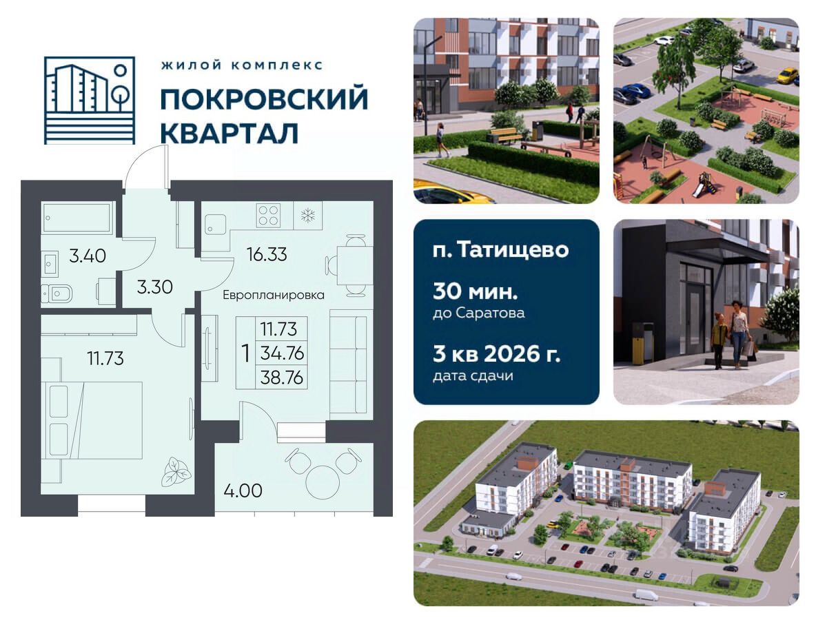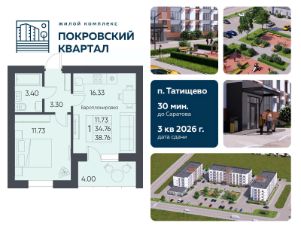 Продаётся 1-комнатная квартира в строящемся доме (Дом 2), срок сдачи: III-кв. 2026, общей площадью 38.76 кв.м., на 1 этаже. Новый жилой комплекс от застройщика СЗ "Орион" расположен по адресу: Саратовская область, рабочий посёлок Татищево, Михайловская улица, 13