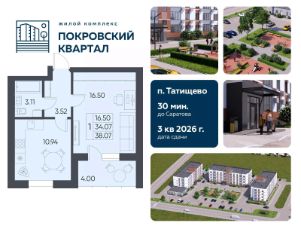 Продаётся 1-комнатная квартира в строящемся доме (Дом 2), срок сдачи: III-кв. 2026, общей площадью 38.07 кв.м., на 4 этаже. Новый жилой комплекс от застройщика СЗ "Орион" расположен по адресу: Саратовская область, рабочий посёлок Татищево, Михайловская улица, 13