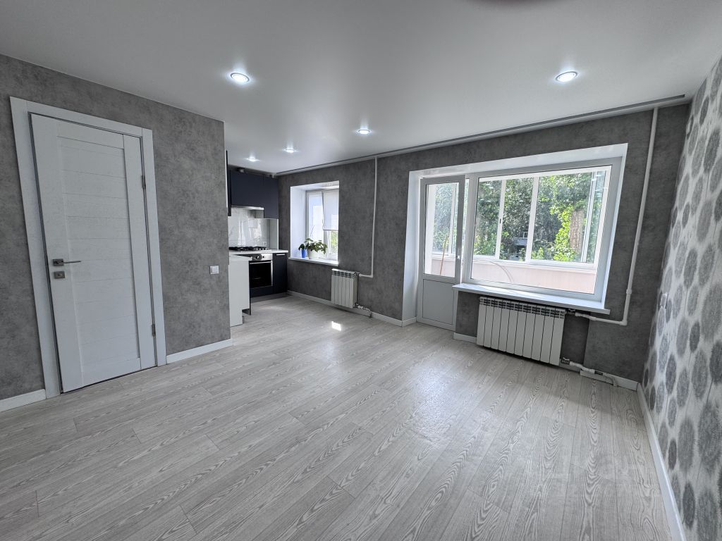 В маленькой комнате встроена гардеробная.Полностью заменена проводка по ГОСТ, натянуты потолки с точечными светильниками.На полу сделана стяжка, стены выровнены.Заменены все трубы водоснабжения и радиаторы.