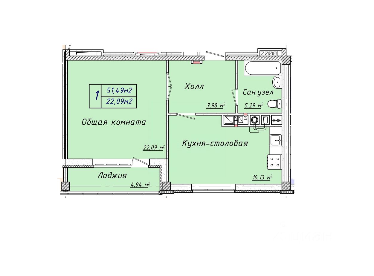 Планировка: Общая площадь 51,6кв.м (47,8 кв.м + лоджия 3,8 кв.м)