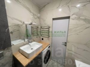 Ванная комната облицована плиткой, установлено большое зеркало с сенсорной подсветкой.