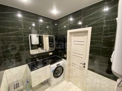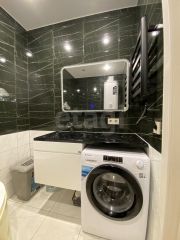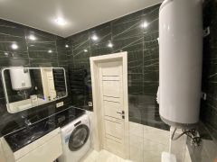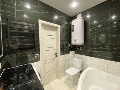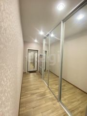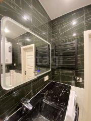Во всех комнатах выполнен качественный ремонт, установлены натяжные потолки с точечными светильниками, на полу ламинат и плитка.