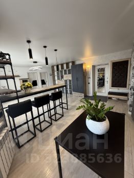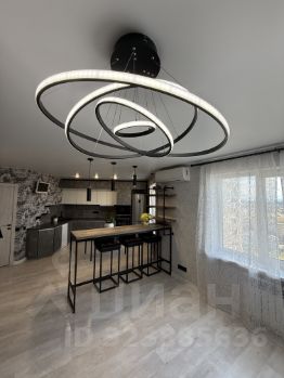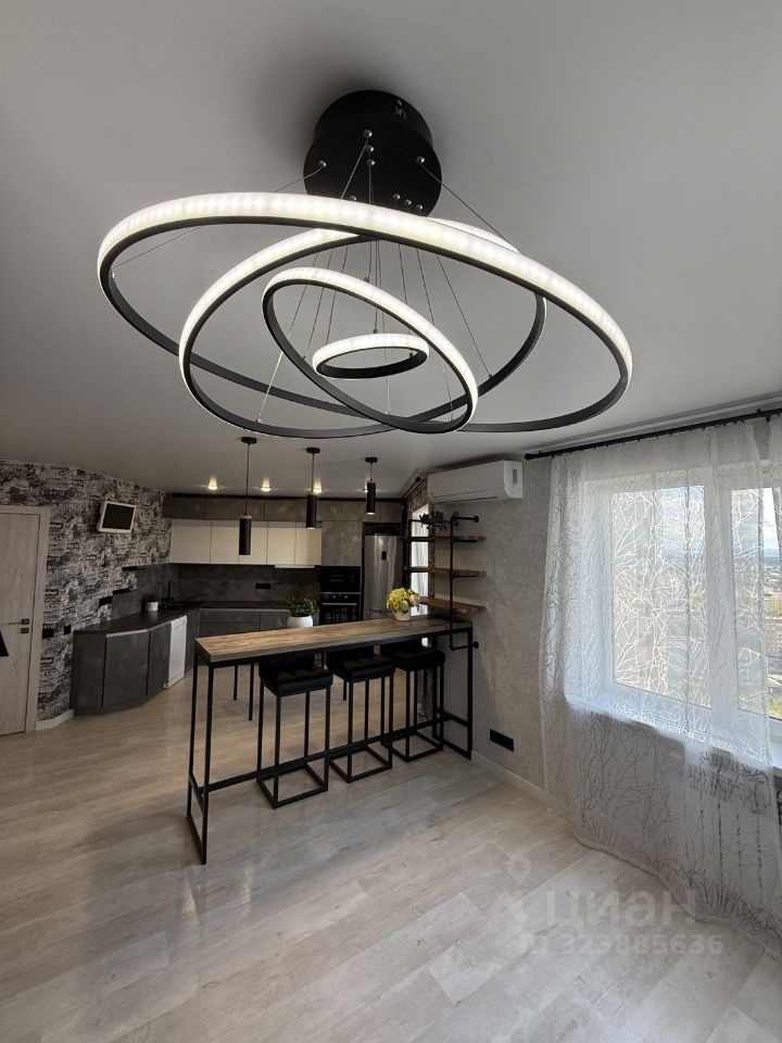40м2 просторная кухня-гостиная в современном стиле с 2-мя зонами: обеденной зоной и зоной отдыха с большим количеством теплого освещения и дизайнерской люстрой в стиле минимализм.