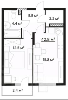 Этаж 2 из 10 этажей. Общая площадь 42,8кв.м. Большая, уютная кухня гостиная площадью 15,8 кв.м. спальня 12,5 кв.м. холл 5,5 кв.м. гардеробная 2,2 кв.м. санузел 4,4 кв.м. балкон 2,4 кв.м.