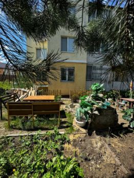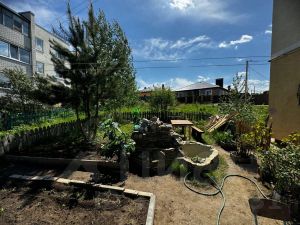 Под окнами расположен палисадник с местом для отдыха с декоративным фонтаном и небольшими грядками.