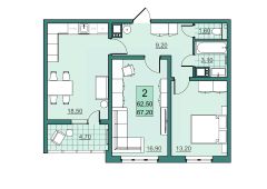 Квартира имеет площадь 67,2 м2. В просторная гостиной 16,9 м2 можно разделить зоны на рабочую и зону отдыха. Кухня 18,5 м2 с выходом на лоджию с панорамным остеклением позволит разместить обеденную зону, зону отдыха и небольшой домашний огород. Спальня 13,9 м2 станет местом уединения, в которой можно будет разместить не только большую двуспальную кровать, но и систему хранения или туалетный столик, не перегружая пространство.