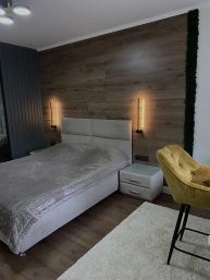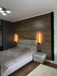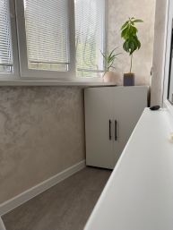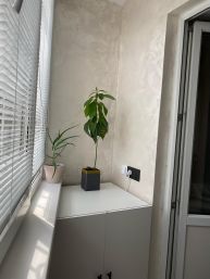 Мастер спальня со своей гардеробной. В гардеробной система хранения из Леруа Мерлен отдельно (брючницы, полочки, обувницы), свой свет на отдельном контуре. Тонированное зеркало. Есть кондиционер, вся трасса в стене, подвод фазы в стене. На стене стабилизированный мох, зонирующий пространство. Большое окно с дверью на балкон. На окнах жалюзи Блэк аут. Балкон утеплён, электрический теплый пол. Дорогая ПВХ плитка на балконе. Разведенная электрика под сушильную машину, утюг и пр.