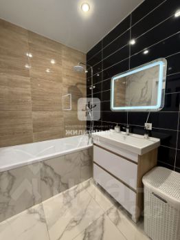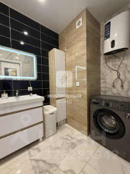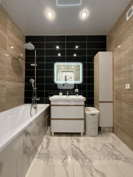 Ванная комната отделана керамогранитом Kerama Marazzi, установлена стиральная машина.