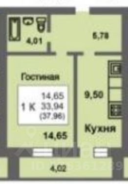 Кухня - 9,5кв.м., комната - 14,65кв.м.