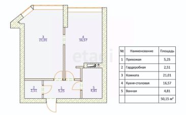 Площадь комнаты составляет 21 кв.м., а кухня-гостиная 16,7 кв.м., что создаёт просторное и уютное пространство для отдыха и приема гостей. Холл площадью 5 кв.м. и санузел 4,8 кв.м. обеспечивают дополнительный комфорт, а гардеробная 2,5 кв.м. поможет организовать ваше хранение.
