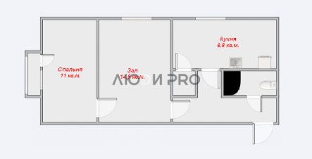 Изолированная спальня с выходом на маленький балкон площадью 11 кв.м., зал площадью 14,5 кв.м. легко сделать изолированной комнатой, удобная кухня площадью 8,8 кв.м., совмещенный санузел. Смотрите план квартиры в объявлении.