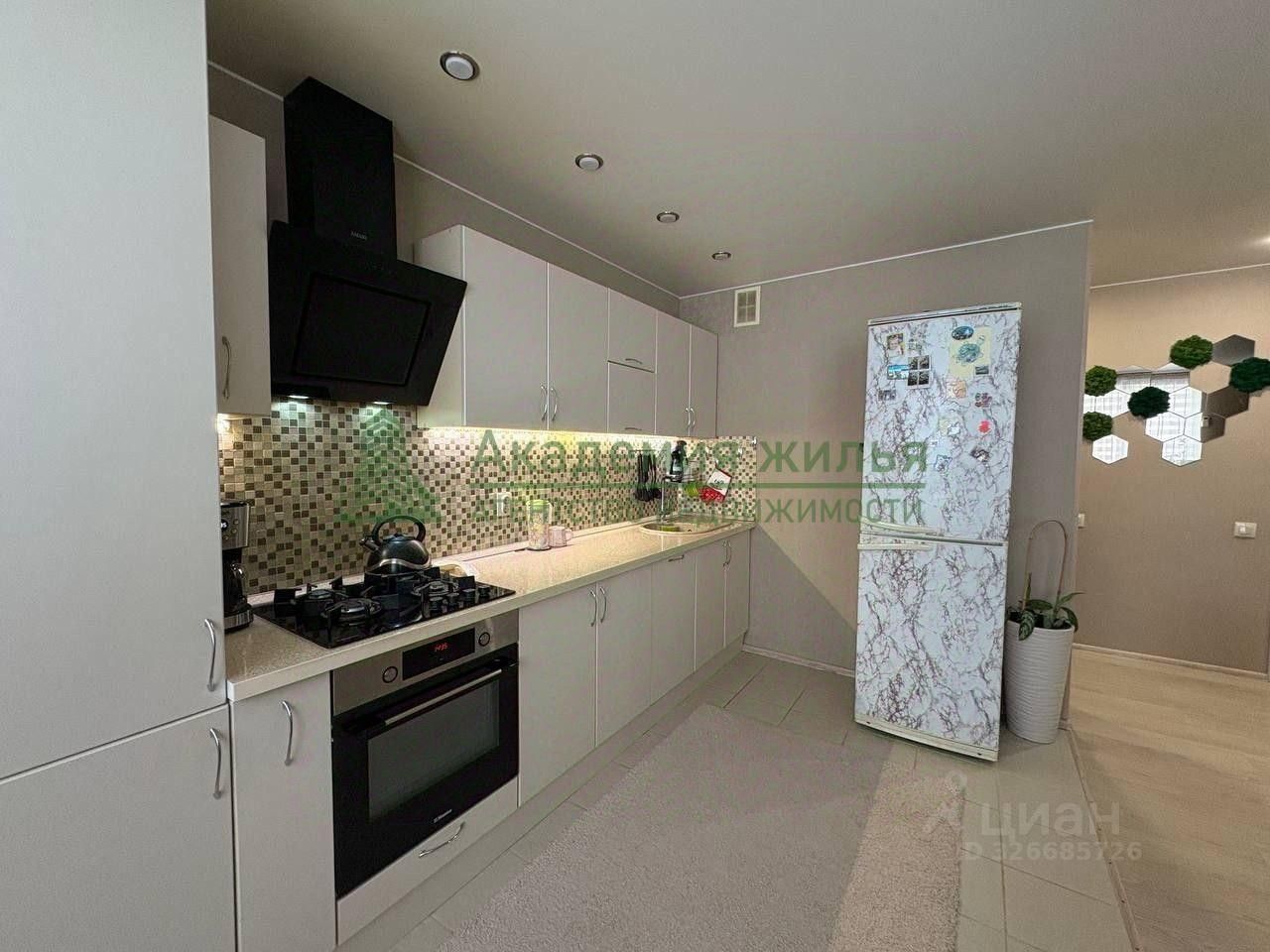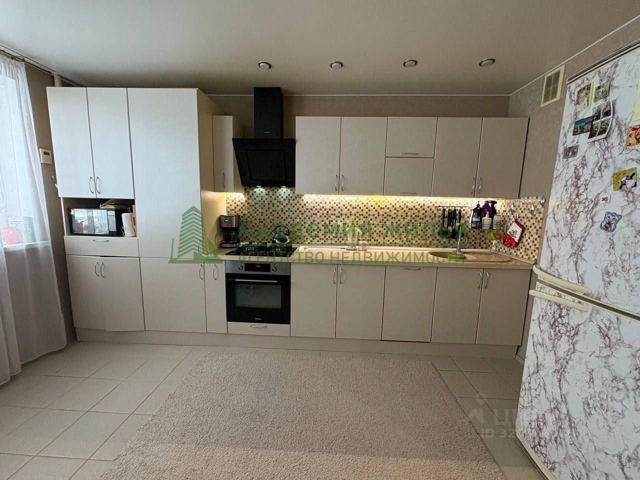 Кухня-гостинная с барной стойкой, просторная, светлая, с качественной отделкой и встроенной техникой.