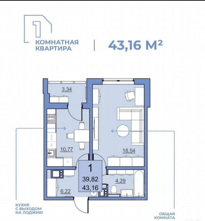 Гостиная 18,54, кухня 10,77, сан. узел 4,29, коридор 6,22, застекления лоджия 3,34 метра.