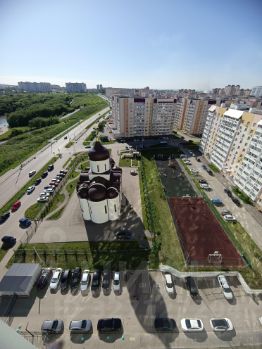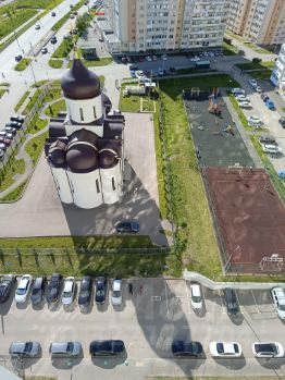 Из окна квартиры шикарный вид на церковь и парк с прудом.