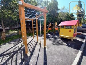 Зелёный двор. Рядом современная детская игровая площадка.