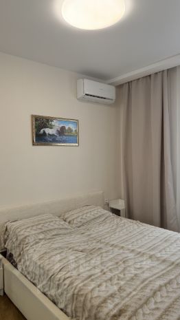 В квартире есть лоджия, где можно организовать зону отдыха. Там стоит большой шкаф в потолок, на окнах есть сетки, и жалюзи , которые легко снимаются. Дом оснащен грузовым лифтом и открытой парковкой во дворе, рядом находится детская площадка. В спальне двуспальная кровать, с возможностью хранением под ней. Две тумбочки, телевизор. Также есть выход на балкон и большая гардеробная.