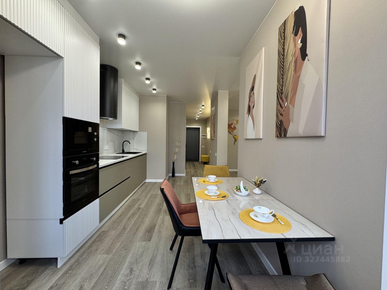 Кухня площадью 21 м² оснащена современной техникой и стильной мебелью, создавая уютную атмосферу для кулинарных экспериментов.