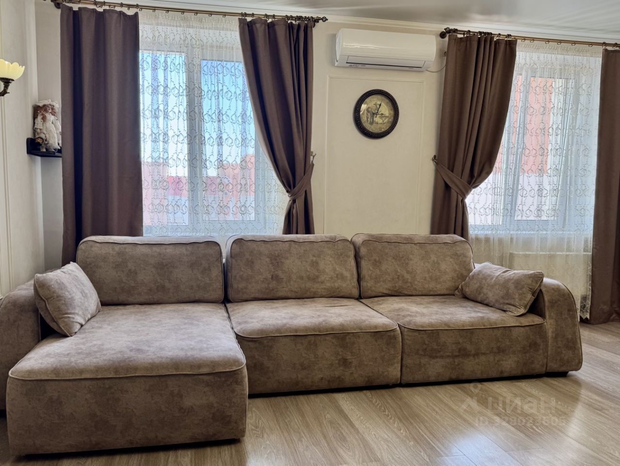 В квартире много естественного света за счёт окон, интерьер выполнен в спокойных, универсальных оттенках пространство выглядит лёгким и уютным.