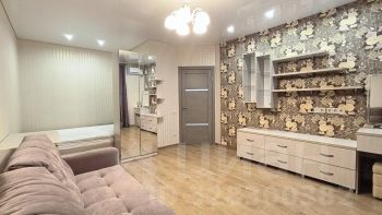 Остается полностью вся мебель в гостиной, кондиционер, кухонный гарнитур со встроенной бытовой техникой. В коридоре установлен вместительный шкаф-купе. Гостиная зонирована на спальную зону и зону отдыха.