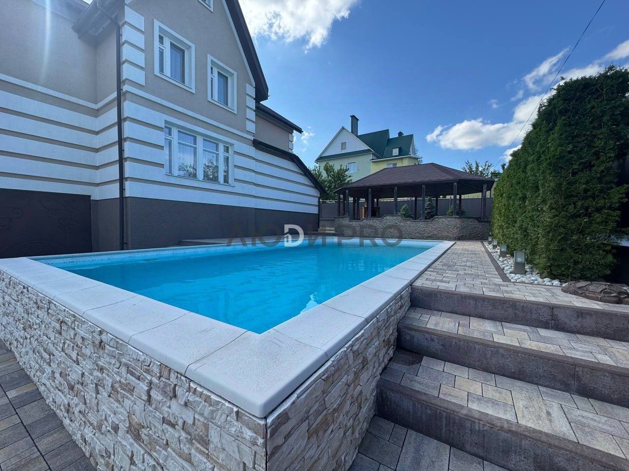 ПОСТРОЙКИ НА УЧАСТКЕ бассейн- цельнобетонная чаша, покрытие 3Д плёнка, оборудование high class, мангальная зона с беседкой, площадка для отдыха, паркинг.