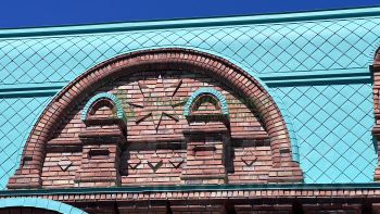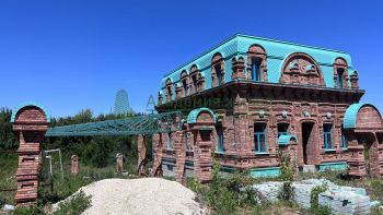 Из архитектурного бетона (ручная работа) сделана брусчатка, цокольные панели, подоконники, гербы РФ все под цвет кровли(патина)